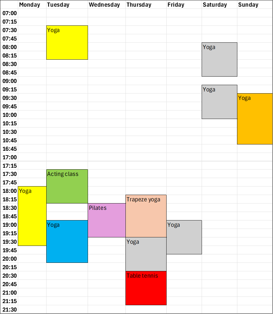 The Braywick Nature Centre has a beautiful small hall. This is a Victorian stable conversion with exposed beams. Primarily for teaching school groups and nature based community events, the hall is also is regularly hired out for classes. The image below details when the hall is generally booked throughout the week. Please note that this only shows regular bookings. The hall is also often busy for team meetings, school groups and ad-hoc hires. Contact us direct with potential dates.